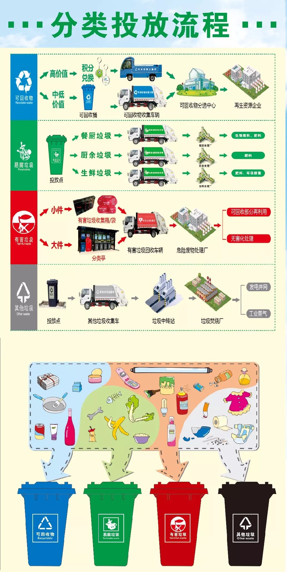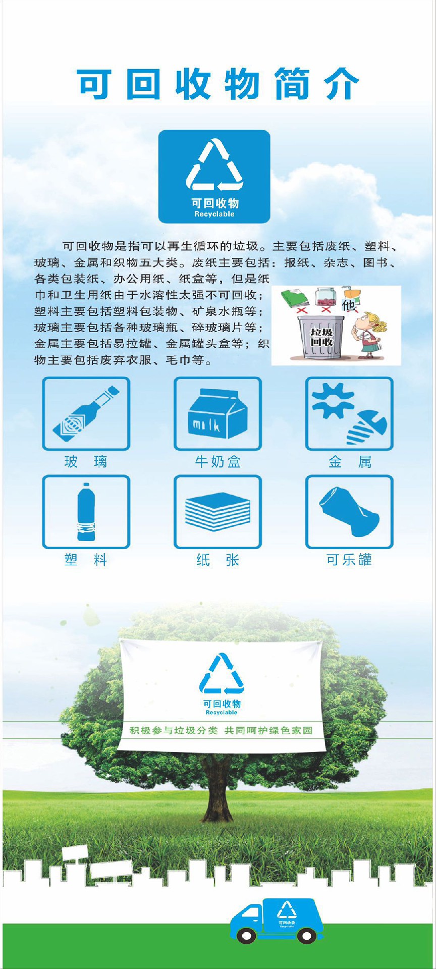 通俗的講,垃圾分類就是在源頭通過分類投放、分類收集,把有用物資,如紙張、塑料、橡膠、玻璃、瓶罐、金屬以及廢舊家用電器等從垃圾中分離出來重新回收、利用,實現(xiàn)垃圾減量化、資源化、無害化處理,變廢為寶。