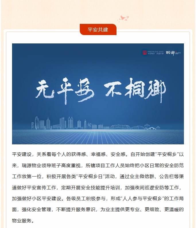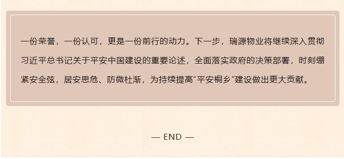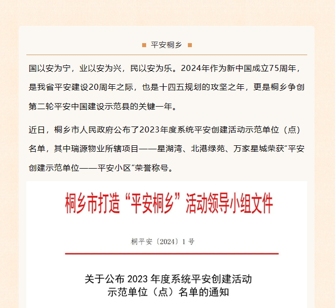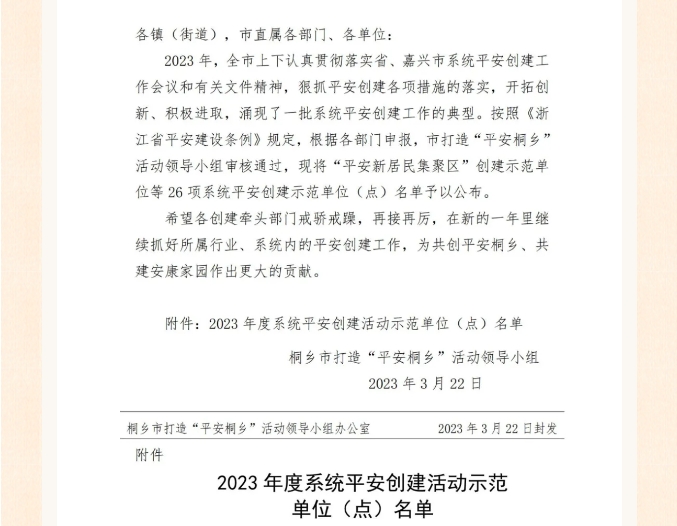 平安共建丨我司榮獲2023年桐鄉(xiāng)市“平安創(chuàng)建示范單位——平安小區(qū)”榮譽(yù)稱號(hào)!